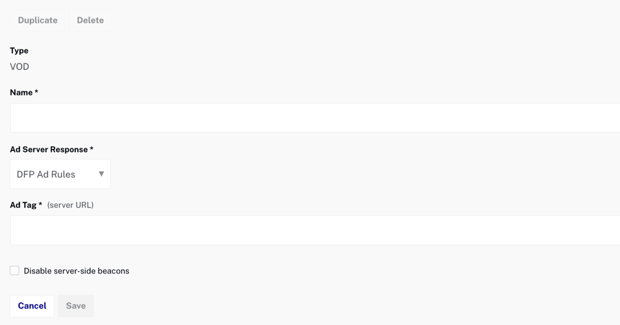 - Vérifier Désactiver les balises côté serveur pour désactiver les balises côté serveur. Lorsqu'il est désactivé, SSAI ne déclenchera aucune balise côté serveur et inclura toutes les balises dans la sortie VMAP.