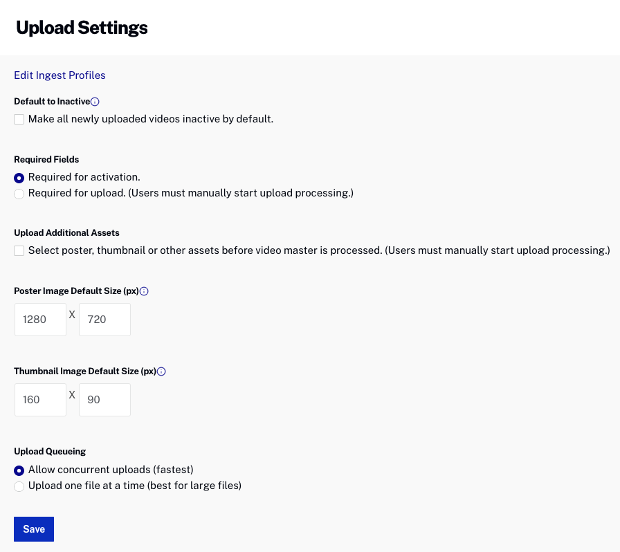 Dimensions de l'image par défaut : ces valeurs peuvent être utilisées pour définir les tailles d'image par défaut pour les affiches et les miniatures. En configurant les tailles dans les paramètres de téléchargement, vous pouvez éviter d'avoir à définir des dimensions d'image dans vos profils d'ingestion. Lorsque ces valeurs sont configurées et que vos profils d'ingestion ont également des tailles d'image, Video Cloud utilisera le processus suivant pour déterminer les dimensions à utiliser pour différents types d'images :