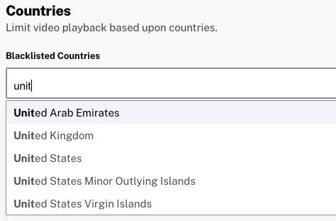 - Sélectionnez les pays qui seront interdits (liste noire) ou autorisés (liste blanche) à afficher. Au fur et à mesure que vous tapez, la liste de sélection sera filtrée.