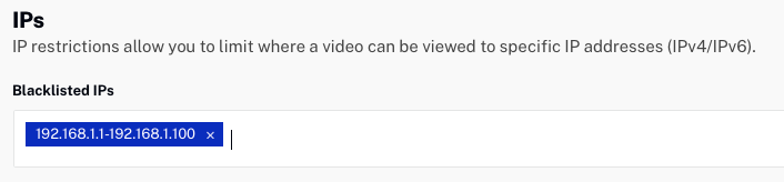 - Saisissez une plage d'adresses IP qui seront interdites (sur liste noire) ou autorisées (sur liste blanche) à consulter. Notation de bloc CIDR est également pris en charge.