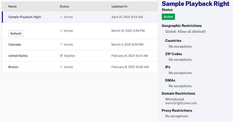 Les restrictions géographiques vous permettent de limiter la lecture vidéo en fonction du pays, du code postal, des adresses IP et de la zone de marché désignée. Pour attribuer des restrictions géographiques à un droit de lecture, procédez comme suit :