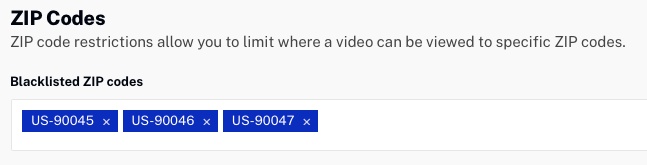- Entrez une liste de codes postaux qui seront interdits (liste noire) ou autorisés (liste blanche) à consulter. Les codes postaux doivent être précédés d'un code de pays à deux lettres majuscules et d'un trait d'union, par exemple, US-90045.