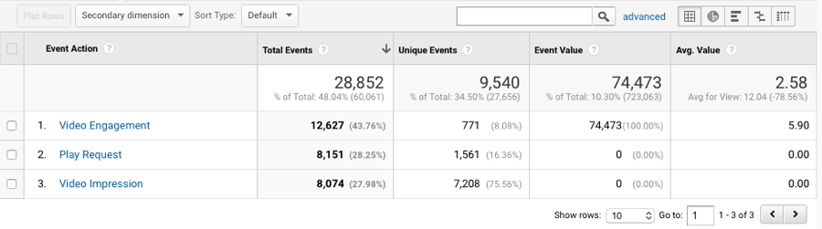 - Tous les événements passés par les joueurs Brightcove seront répertoriés. Dans cet exemple, trois événements ont été passés.