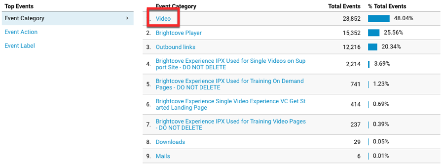 - Clique sur le Vidéo Catégorie d'événement. Les événements envoyés à Google Analytics par Brightcove Players auront la catégorie Vidéo comme catégorie d'événement.