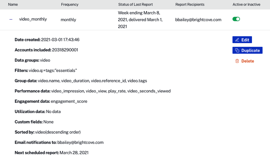 Pour dupliquer une définition de rapport, cliquez sur + à côté du nom du rapport pour ouvrir les détails du rapport, puis cliquez sur le bouton Dupliquer lien. Une copie de la définition de rapport s'affichera. Apportez les modifications nécessaires à la définition du rapport. Mettez à jour le nom du rapport, Report Name, puis cliquez sur Schedule Report.