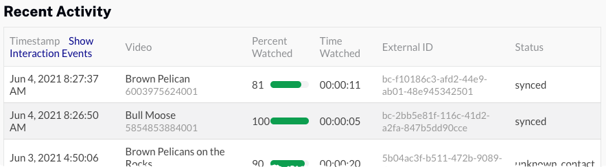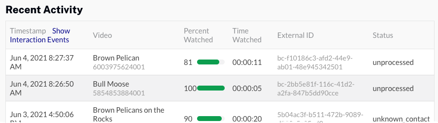 - Confirmez qu'il existe un événement avec un horodatage récent indiquant le nom de la vidéo qui vient d'être regardée. L'état de l'événement doit être non traité. Cela indique que Campaign a capturé la vue mais n'a pas encore tenté de la synchroniser avec Eloqua.