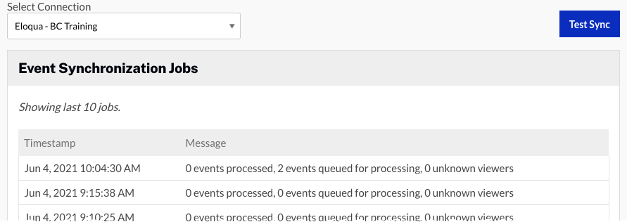 - synchronisé : indique que l'utilisateur était un utilisateur connu et que les données ont été correctement enregistrées dans son journal d'activité. Les données devraient également être visualisées dans Eloqua en quelques minutes.