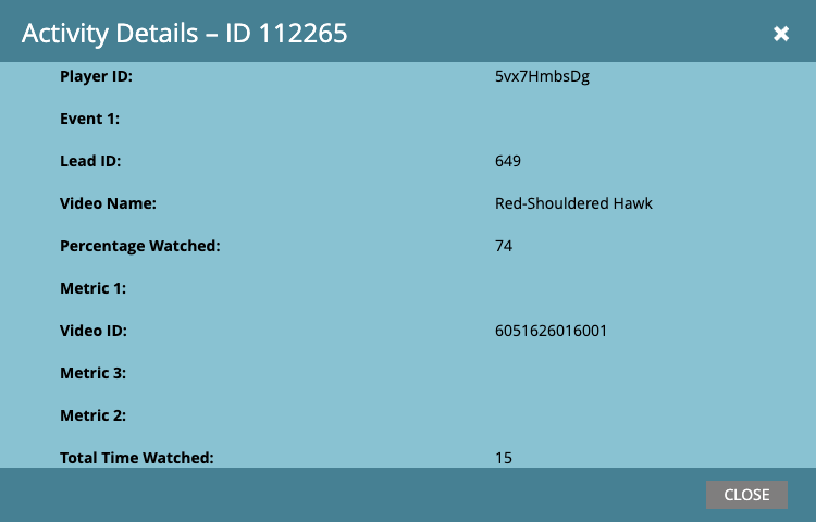 - Double-cliquez sur une ligne pour afficher les champs que la campagne a renseignés. La fenêtre contextuelle affichera les données de visualisation de la vidéo fournies par Campaign à Marketo, telles que l'ID du joueur, l'ID de la vidéo, le nom de la vidéo, le pourcentage de visionnage et d'autres champs.