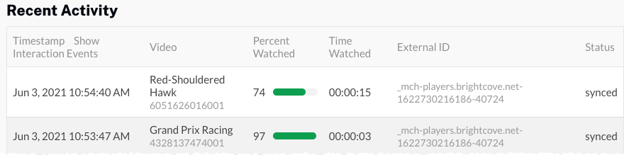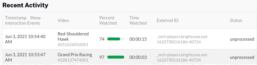 - Confirmez qu'il existe un événement avec un horodatage récent indiquant le nom de la vidéo qui vient d'être regardée. L'état de l'événement doit être non traité. Cela indique que Campaign a capturé la vue mais n'a pas encore tenté de la synchroniser avec Marketo.