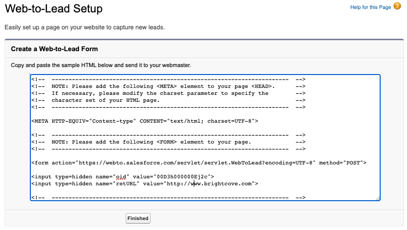 La fonctionnalité Web-to-Lead de Salesforce peut être utilisée pour générer des informations de prospect auprès des visiteurs du site Web. Ces formulaires peuvent également être affichés à l'intérieur des joueurs de Brightcove. Les étapes ci-dessous créeront un formulaire simple pour saisir le prénom, le nom, l'adresse e-mail, l'entreprise, la ville et l'état/la province. Pour plus d'informations sur la fonctionnalité Web-to-Lead, reportez-vous à la documentation Salesforce.