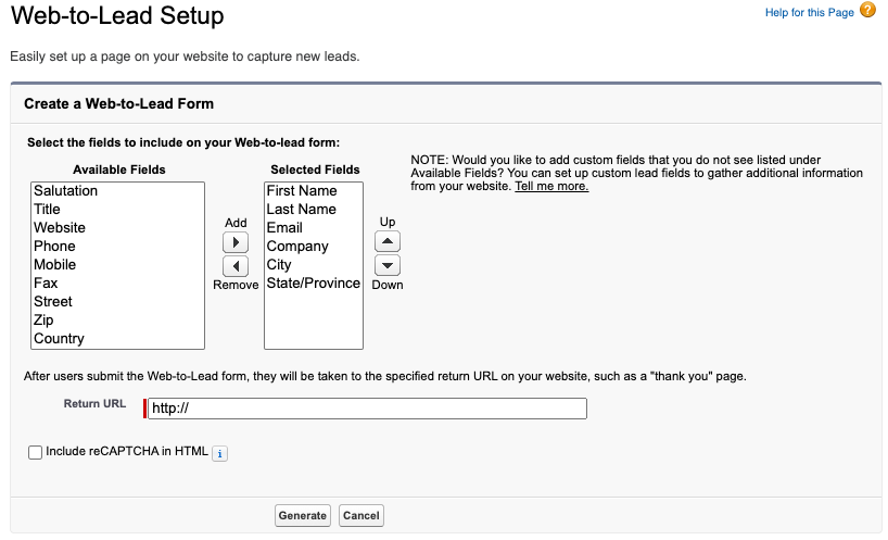- Sélectionnez les champs à inclure dans votre formulaire Web-to-Lead. Utilisez les flèches Ajouter et Supprimer pour déplacer les champs entre les Champs disponibles liste et le Champs sélectionnés liste et utilisez les flèches haut et bas pour modifier l'ordre des champs de votre formulaire.