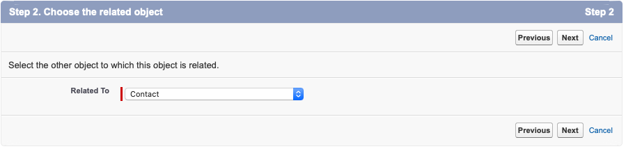 - Dans le Relatif à liste déroulante, sélectionnez Contact. Cliquez sur Next (Suivant).