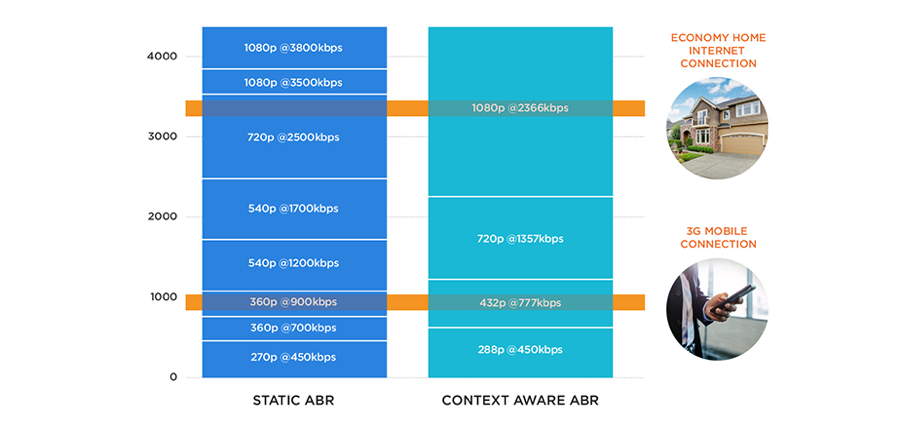 De même, un utilisateur disposant d'un forfait Internet résidentiel à prix économique fournissant 3 000 kbps de bande passante soutenue dépasserait le rendu 720p sous l'échelle ABR statique, tandis qu'il serait capable de diffuser en 1080p en utilisant l'encodage contextuel, offrant un Full HD vivre.