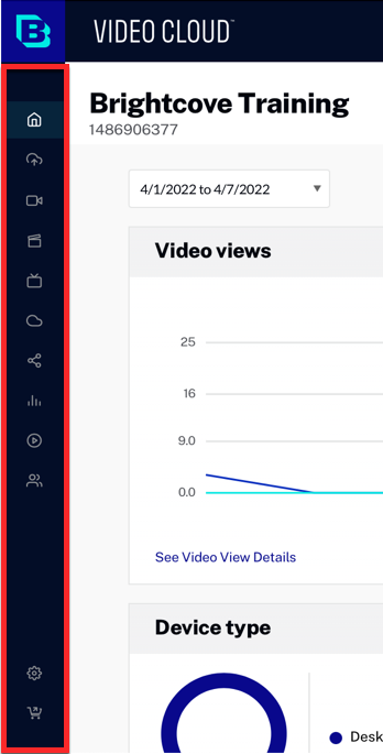 La navigation principale de Video Cloud Studio permet d'accéder aux modules de Studio.