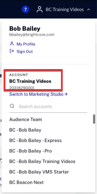 Si vous avez accès à plusieurs comptes Video Cloud, la liste déroulante de sélection de compte Video Cloud permet de sélectionner le compte Video Cloud auquel vous souhaitez accéder. Pour changer de compte, cliquez sur l'icône Profil dans le coin supérieur droit de Video Cloud Studio. Le nom du compte actuel apparaît dans l'en-tête et au-dessus de la liste des comptes.