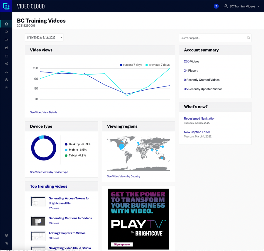 - Résumé du compte - Affiche le nombre total de vidéos et de lecteurs dans le compte et le nombre de vidéos récemment créées et mises à jour. Cliquez sur un numéro pour ouvrir le module Media ou Lecteurs.