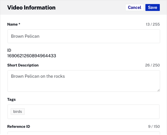 - Cliquez sur le titre de la vidéo http://support.brightcove.com/test-assets/videos/oystercatcher.mp4 , localisez la section Informations sur la vidéo et cliquez sur Modifier. Définissez les propriétés suivantes :