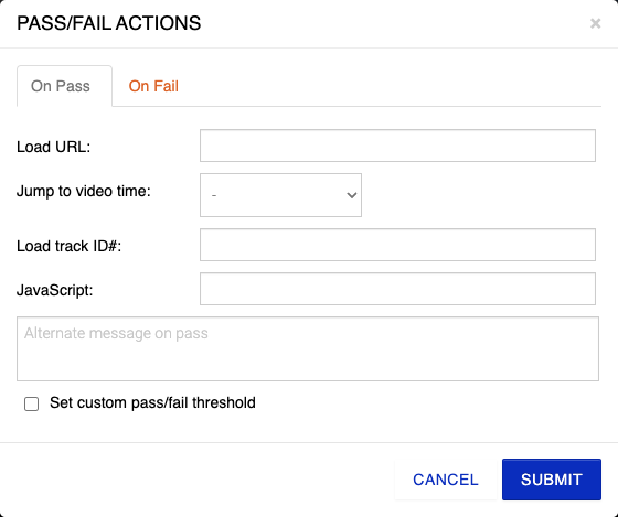 Des onglets " Réussite " et " Échec " peuvent être configurés en fonction de la réussite ou de l'échec de l'utilisateur. Par défaut, pour réussir le quiz, le spectateur doit répondre correctement à au moins 51 % des questions. Cela peut être ajusté en cliquant sur Définir un seuil de réussite ou d'échec personnalisé.