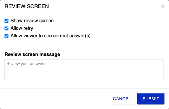 - Message de l'écran de révision - Définit un message texte que le spectateur voit après avoir envoyé le document. La valeur par défaut est "Réviser vos réponses"