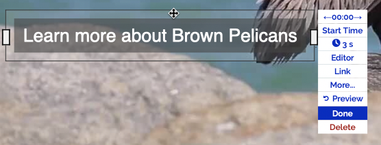 Les incrustations de texte sont utilisées pour afficher du texte sur une vidéo pendant la lecture. La superposition peut également être cliquable et ouvrir une autre page du navigateur lorsque l'on clique dessus. Dans l'exemple suivant, le texte superposé apparaît au point 75 % de la vidéo et reste affiché jusqu'à la fin de la vidéo. En cliquant sur la superposition, un lien s'ouvrira dans un nouvel onglet du navigateur et la vidéo sera mise en pause.