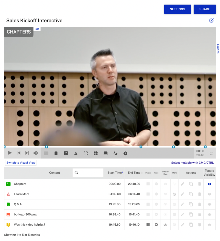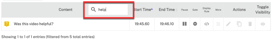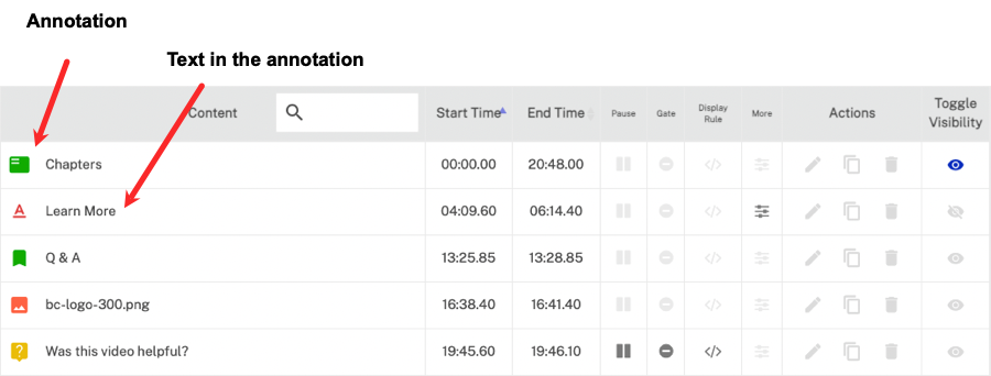 Vous pouvez également voir rapidement quelles sont les annotations pour lesquelles des options d'annotation ont été définies, telles que la pause, la porte ou la règle d'affichage. L'icône Plus indique principalement qu'un lien est établi. La colonne Actions vous permet de modifier, copier ou supprimer l'annotation. Cliquez sur l'icône Basculer la visibilité pour masquer/afficher l'annotation dans l'éditeur d'interactivité. L'option Basculer la visibilité n'a aucun effet sur l'affichage de l'annotation dans les vidéos.