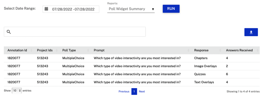 - En haut de la page, utilisez le sélecteur de rapport pour sélectionner le Résumé du widget de sondage rapport.