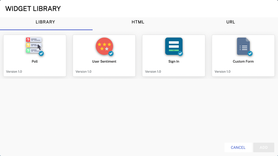 La bibliothèque de widgets personnalisés est un ensemble d'interactions plus avancées que vous pouvez ajouter en un seul clic à vos projets. Il n'est pas nécessaire d'écrire du code HTML, JavaScript ou CSS. Toutes les annotations personnalisées doivent être testées de manière approfondie avant d'être mises en ligne.