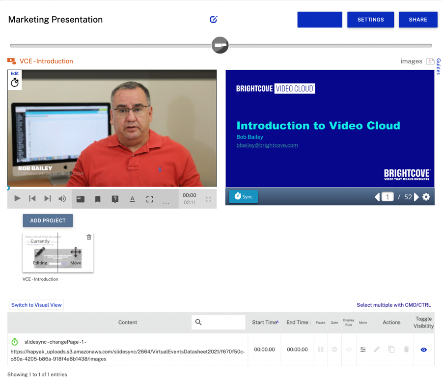 - Pour ajouter une autre vidéo, cliquez sur le bouton AJOUTER PROJET dans la liste de lecture, sous la zone des vidéos et des diapositives.