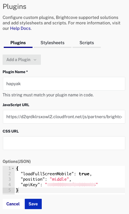 - Pour le plugin Options(JSON), vous aurez besoin de la valeur de votre clé de lecture de l'API HapYak. Pour obtenir votre clé de lecture API, connectez-vous à votre compte Brightcove Interactivity et cliquez sur Intégrations dans la navigation principale (ou cliquez ici). Lorsque vous avez la clé, pour les Options (JSON), entrez :