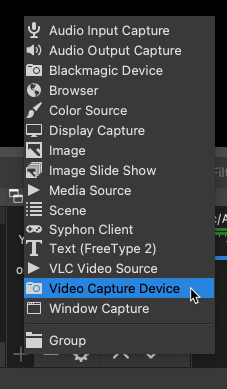 - Dans le Sources rubrique, cliquez sur + pour ajouter une nouvelle source. Sélectionnez une source dans la liste. Ce démarrage rapide utilise un appareil photo pour la capture vidéo, c'est pourquoi l'option Périphérique de capture vidéo est sélectionnée.
