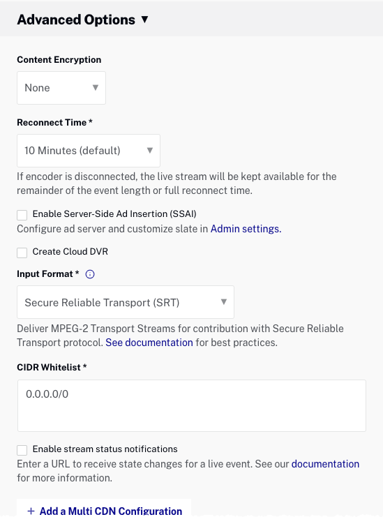 - Dans le Liste blanche CIDR section, entrez un ensemble d'adresses IP autorisées à se connecter au point de terminaison SRT. Cela contrôle qui peut se connecter aux points de terminaison SRT. Notez que cette option n'apparaîtra que si le Format d'entrée est RTP ou SRT. Vous pouvez spécifier