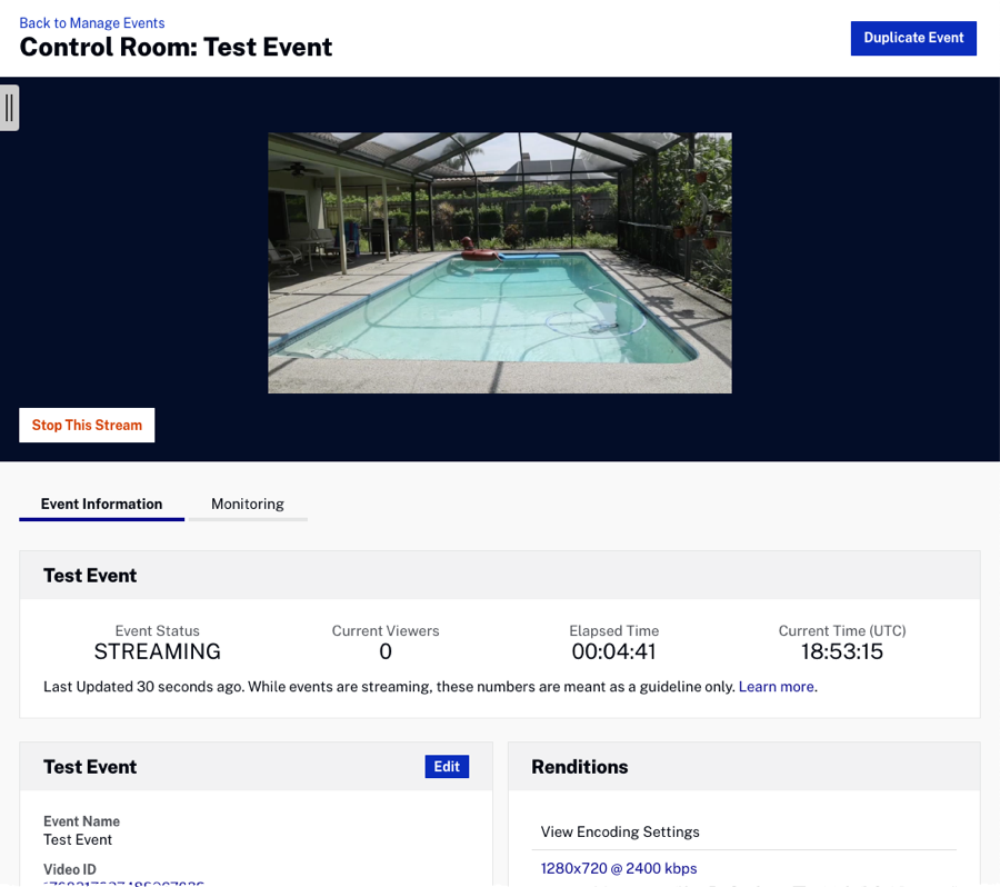 - Vérifiez que vous voyez bien le flux en direct. Notez qu'après le démarrage de l'encodeur, il peut prendre une minute pour que le flux en direct apparaisse.