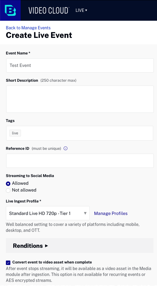 - Sélectionnez Convertir l'événement en actif vidéo une fois terminé. Cela permettra d'enregistrer l'événement sous forme de vidéo dans le module Media.