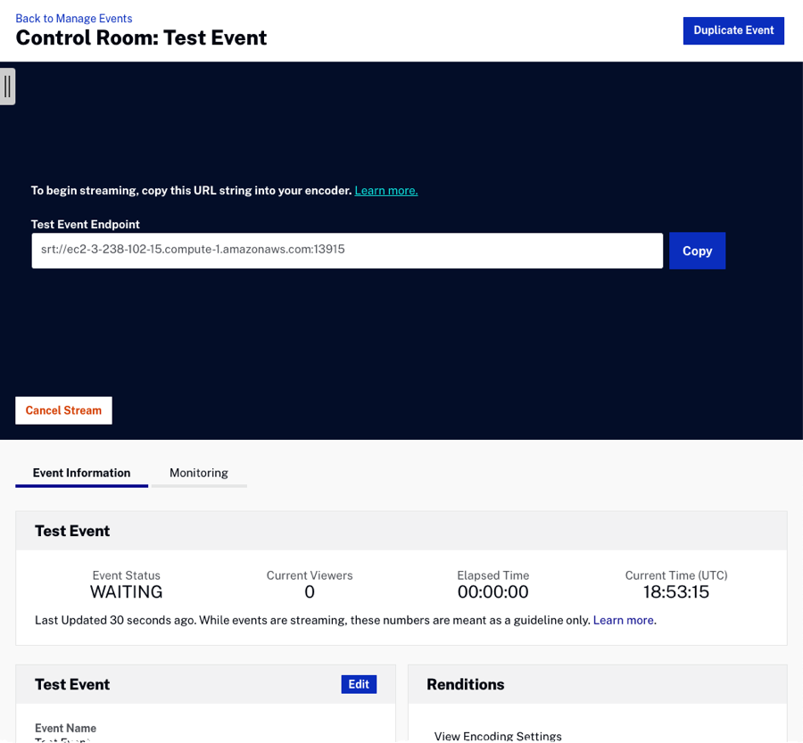 - Si la page Salle de contrôle de l'événement n'est pas affichée, cliquez sur l'onglet Live pour afficher la liste des événements en direct. Cliquez sur le nom de l'événement pour ouvrir le Salle de contrôle page.