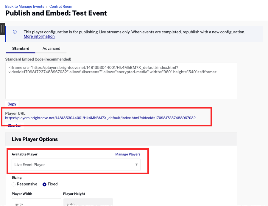 - L'URL du lecteur à laquelle vous avez publié l'événement en direct