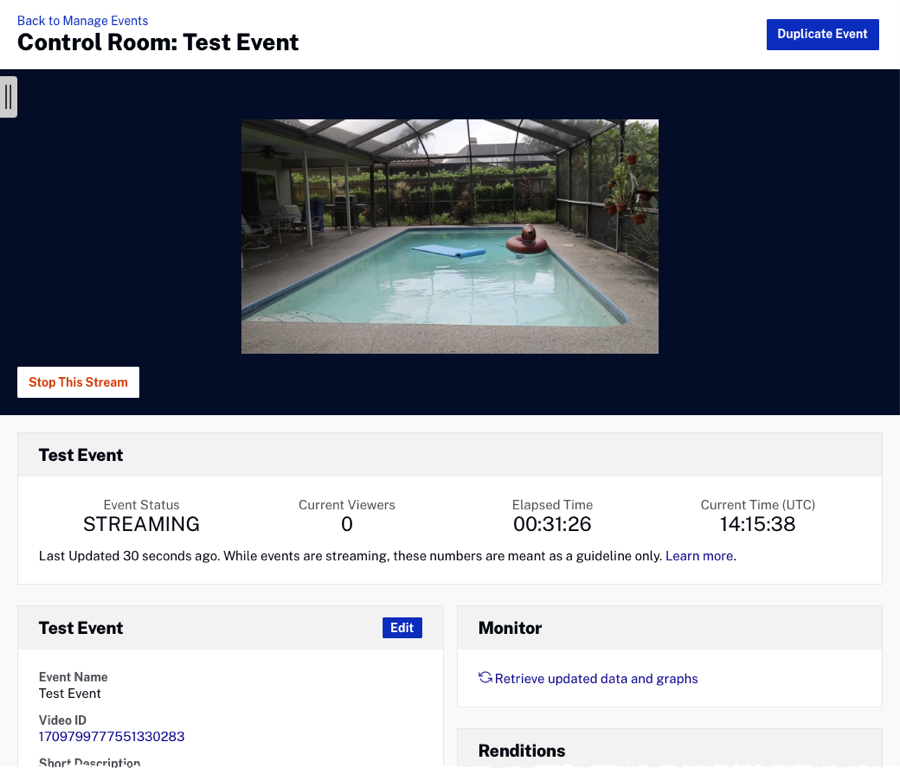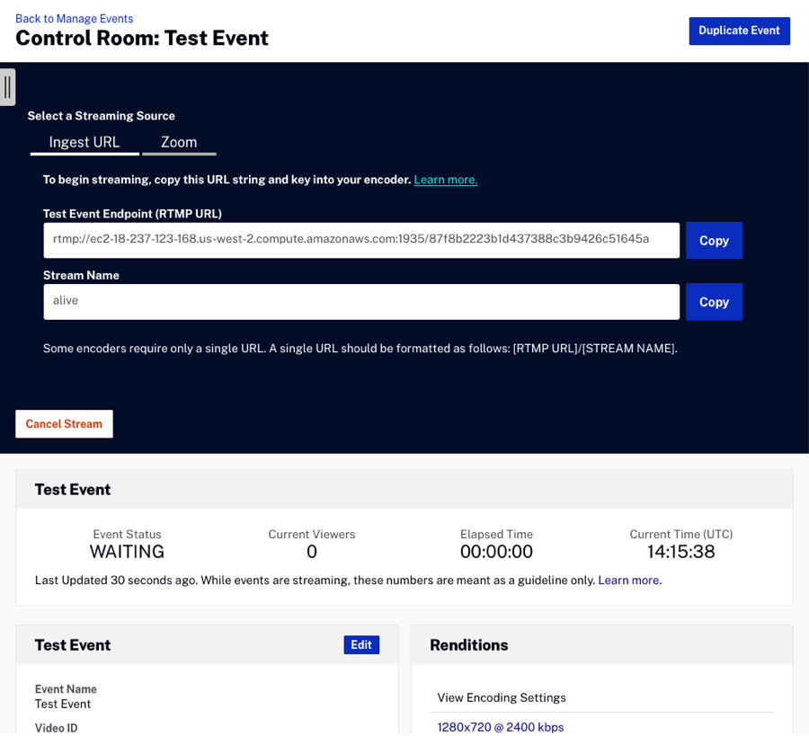 - Cliquez sur Créer un événement. Le module Live renvoie un point de terminaison de flux (URL RTMP) et un nom de flux. Ces valeurs seront utilisées dans les paramètres de l'encodeur.