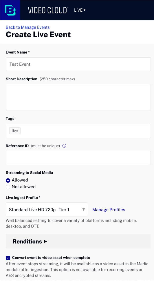 - Sélectionnez Convertir l'événement en actif vidéo une fois terminé. Cela permettra d'enregistrer l'événement sous forme de vidéo dans le module Media.