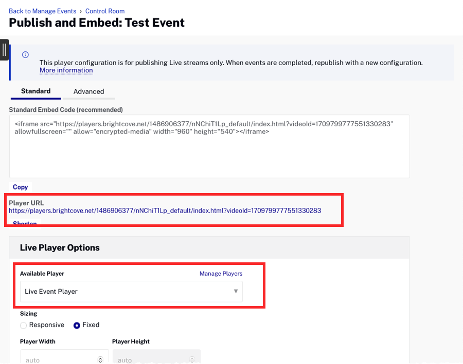 - L'URL du lecteur à laquelle vous avez publié l'événement en direct