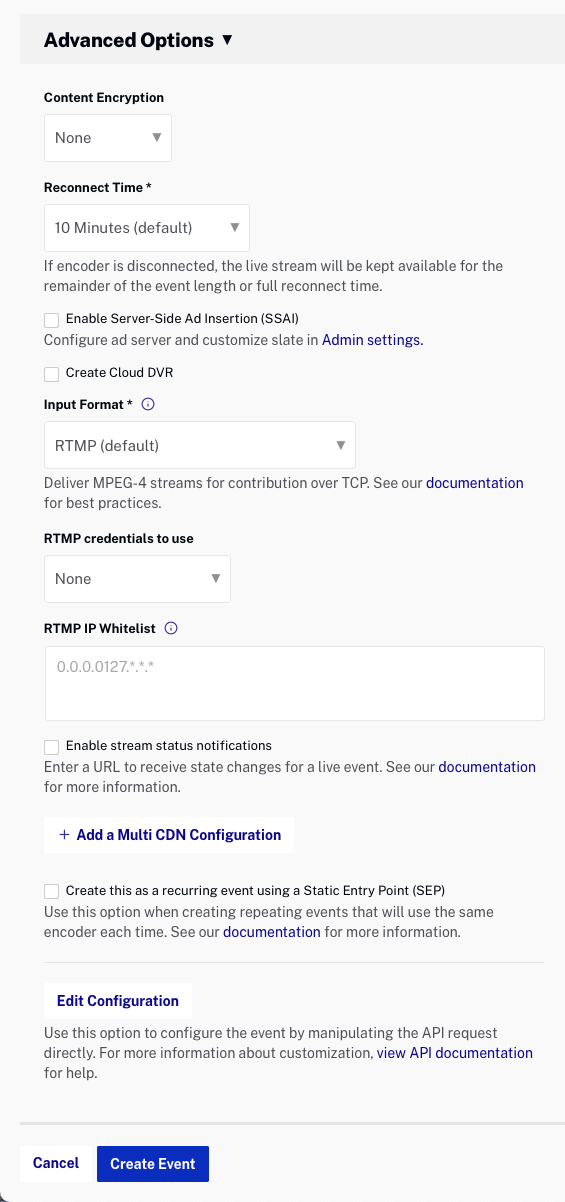 - Durée de reconnexion : si l'encodeur est déconnecté, il s'agit de la durée pendant laquelle le flux en direct restera disponible. Ce paramètre n'a aucun effet sur le délai de démarrage de l'encodeur lors de la création d'un nouvel événement.