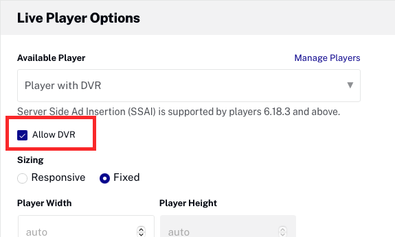 - Lorsque l'option Autoriser DVR est cochée, le lecteur demandera le manifeste DVR au lieu du manifeste en direct. Cette option n'est disponible que si l'événement a été créé avec l'option Créer un DVR Cloud sélectionnée. Si l'événement est publié à l'aide d'une version Brightcove Player antérieure à la version 6.33.0, le plug-in Live DVRUX est requis.