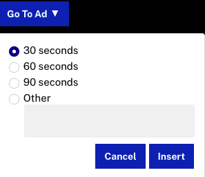 Si la Activer l'insertion d'annonces côté serveur (SSAI) a été sélectionnée lors de la création de l'événement, la page Control Room affichera un Aller à l'annonce bouton. Lorsque vous cliquez dessus, la durée du saut d'annonce peut être sélectionnée.