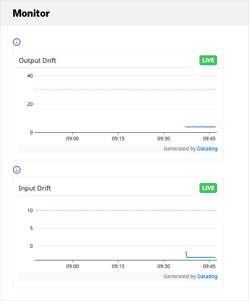 La section Monitor affiche les dérives d'entrée et de sortie du flux. Cliquez sur Récupérer les données et les graphiques mis à jour pour afficher les graphiques mis à jour. Si le compte est activé pour une surveillance étendue, la section Surveillance sera remplacée par un onglet Surveillance sous le lecteur de prévisualisation. Voir la section sur la surveillance étendue pour plus de détails.