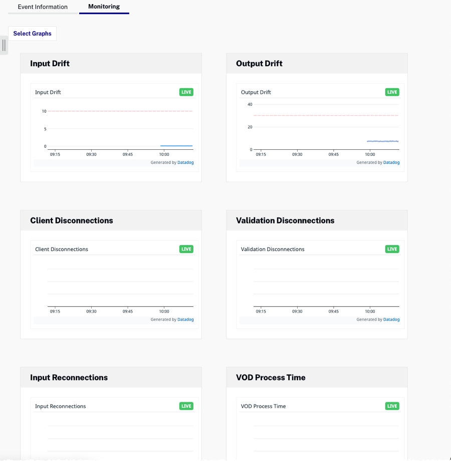 Par défaut, le module Live affiche une section Monitor avec des graphiques de dérive de sortie et d'entrée. Si vous souhaitez activer la surveillance étendue, veuillez contacter votre représentant du compte Brightcove. La surveillance étendue affiche un onglet Surveillance sous le lecteur de prévisualisation. Les informations de surveillance sont disponibles pendant qu'un événement est en cours et jusqu'à 1 heure après la fin de l'événement.
