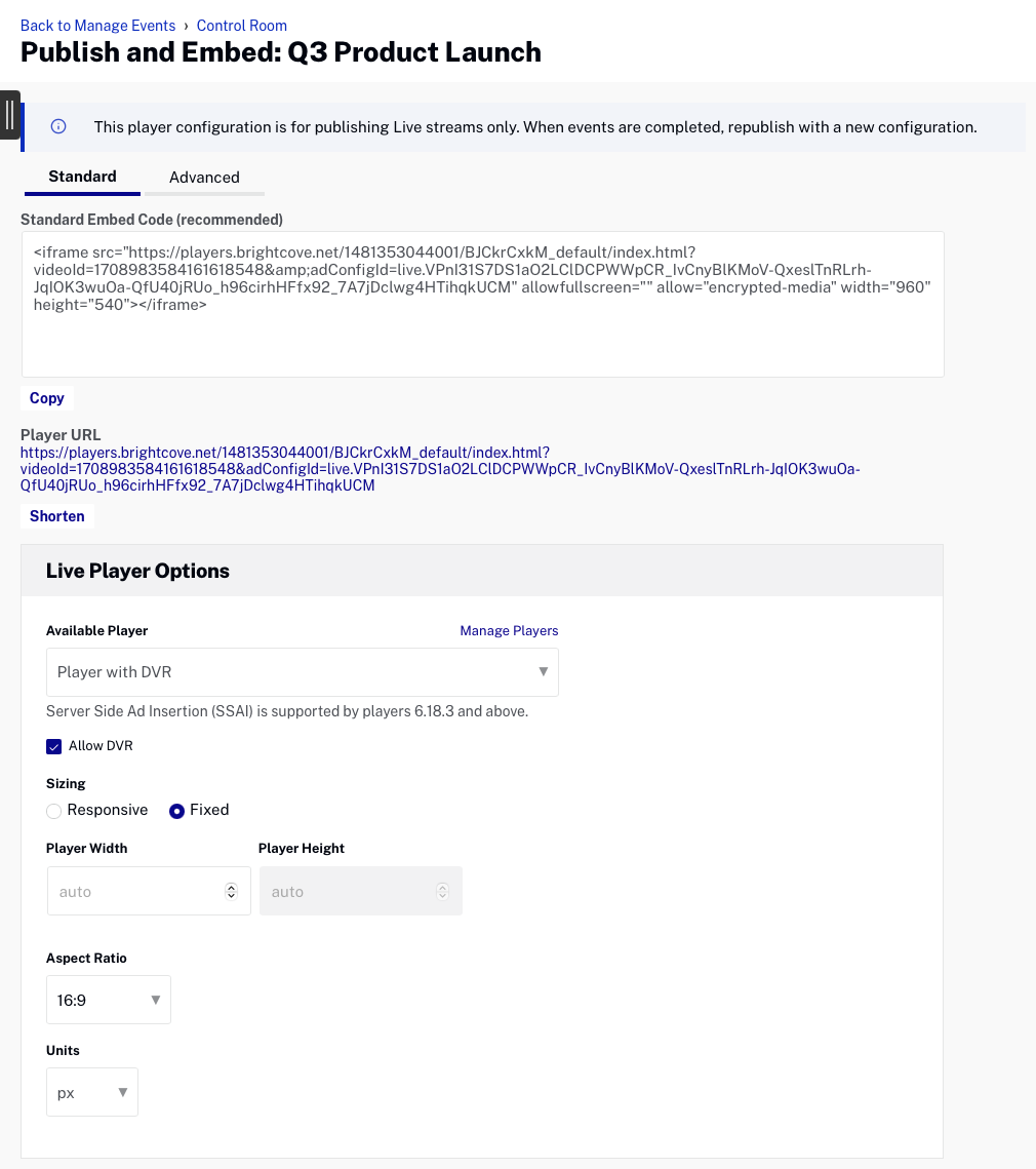 - Clique le URL du lecteur pour prévisualiser l'événement dans un navigateur ou copier le code d'intégration approprié à utiliser.