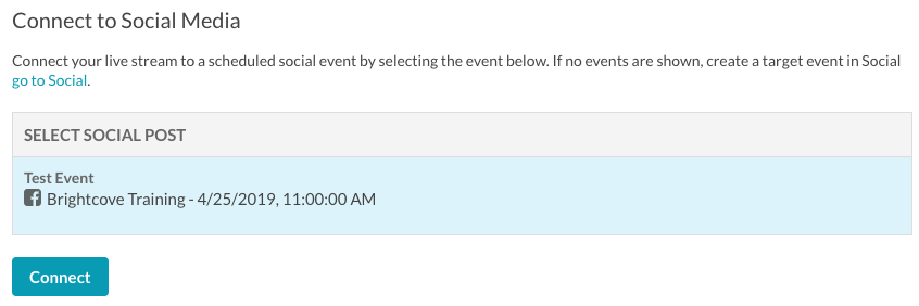 Il est possible de connecter un événement en direct à un événement social programmé dans le module Social. Avant de pouvoir connecter un événement en direct à un événement social, vous devez créer un événement en direct dans le module Social. Seuls les événements qui ont été créés avec le paramètre Diffusion en continu sur les réseaux sociaux défini sur Autorisé peuvent être affectés à un événement planifié.