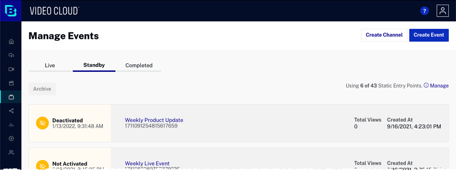 Selon votre abonnement Live, vous pouvez créer des événements, des chaînes ou les deux. Généralement, les événements sont créés pour diffuser des événements plus courts, ponctuels ou récurrents. Les canaux sont généralement utilisés lors de la diffusion d'événements en direct 24/7.