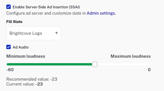 - Quand le Annonce audio est coché, les niveaux audio des annonces seront normalisés en fonction de l'ajustement défini. Cela peut être utilisé comme un moyen de s'assurer que les annonces ne sont pas beaucoup plus fortes que le contenu. Brightcove recommande de sélectionner cette option.