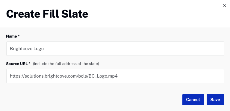 Les ardoises de remplissage sont des vidéos qui seront affichées lorsqu'il y a des lacunes dans un saut de diffusion en direct qui ne peuvent pas être comblées avec une annonce diffusée dynamiquement. Si l'annonce demandée est plus courte que le temps de pause, l'ardoise de remplissage sera affichée afin que les spectateurs ne voient pas de lecteur vide. Vous devez configurer au moins une ardoise de remplissage avant de demander une annonce côté serveur. Les ardoises publicitaires sont configurées dans le cadre des paramètres Live dans le module Admin. Dans cet exemple, une ardoise de remplissage affichant le logo Brightcove a été définie.