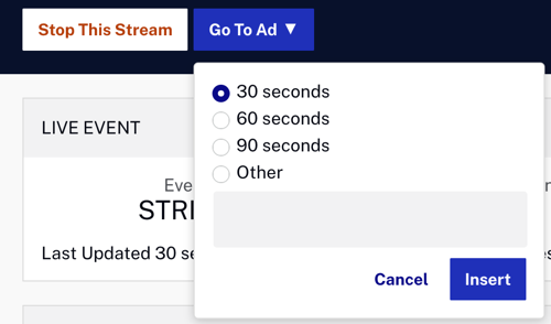 - Les annonces sont insérées aux points de repère envoyés par votre encodeur ou vous pouvez créer un point de repère instantané à l'aide du module Live Control Room