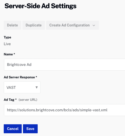 Avant de pouvoir diffuser des annonces côté serveur, les paramètres des annonces côté serveur doivent être configurés. Les paramètres des annonces côté serveur définissent divers aspects de la lecture des annonces, notamment les appels publicitaires, le timing, les balises et d'autres options de configuration des annonces. Ces paramètres sont configurés dans le cadre des paramètres des annonces côté serveur dans le module Admin. Dans cet exemple, une balise d'annonce simple est définie.